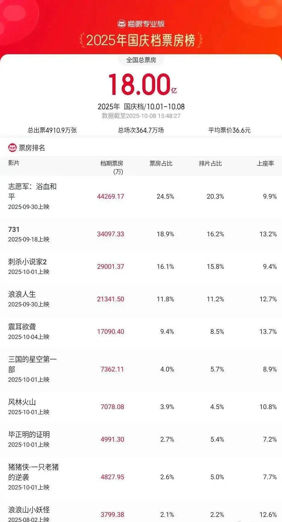 据猫眼专业版数据,截至10月8日15时,2025年国庆档档期票房破18亿,《志愿军:浴血和平》《731》《刺杀小说家2》分列国庆档票房榜前三位。